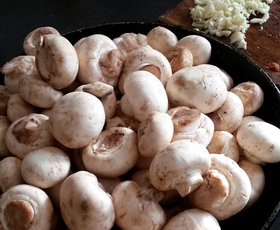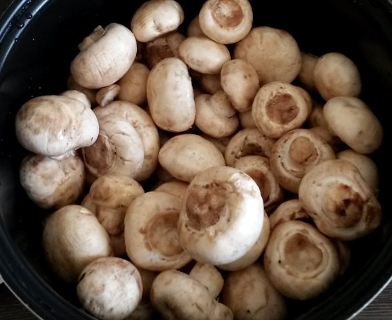 Для начала мы тщательно промываем грибочки под проточной водой. Маленькие шампиньоны оставляем целыми, а большие разрезаем пополам, чеснок чистим и измельчаем.