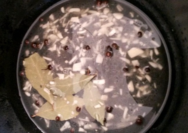 Затем наливаем в чашу мультиварки воду, растительное масло и уксус, добавляем перец горошком, чеснок, лавровый лист, соль и сахар.