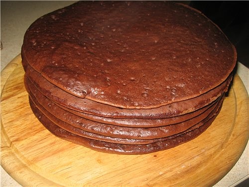 Очень важно помнить, что бисквитные коржи необходимо выпекать на среднем огне, по другому они плохо и не ровно поднимутся. Из сковороды вынимать нужно ловко, закрыв доской и переворачивая на нее. Коржи получаются очень мягкие, потому пропитывать их не нужно. Верхняя часть коржа приобретает красивый блестяще-глянцевый тёмно-коричневый оттенок, нижняя часть коржа - матовая и более светлая.