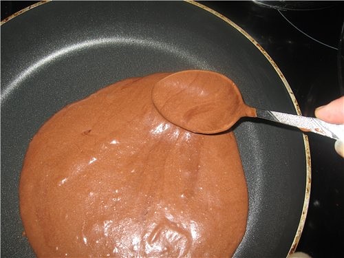Сковороду смазываем маслом и разогреваем. Вливаем тесто, равномерно распределив по всей поверхности сковороды (можно разровнять ложкой).