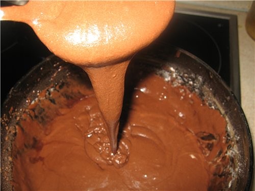 Готовить бисквит на сковороде - одно удовольствие. Самое сложное - это правильно замесить тесто, но месить его легко. Сначала взбить яйца с сахаром, всыпать какао, влить растопленное масло, кефир и вмешать муку с содой. Тесто получается сметанообразным - в меру густым и вязким.