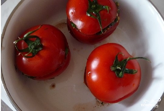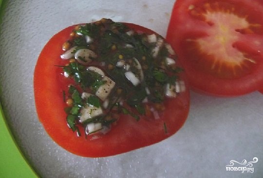 Смазать маринадом каждый кружок помидора.