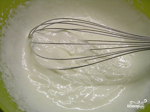 Пока коржи остывают, займемся кремом. Для этого взбиваем сметану с сахаром. Можно добавить в крем немного ванильного сахара.