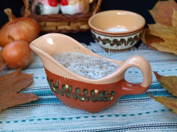 Готовый сливочный соус с грибами перелить в соусник и сразу подавать на стол.