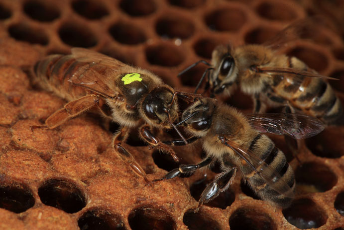Ну, это не проблема. Не очень конечно легко, её пчёлы не больно на обозрение дают. Найдёшь, метку на спинку (грудка это по пчелиному). И потом она уже видна сразу. За пчёлками не больно спрячешься. Нарядная бегает. Нужно это. Для контроля за ней, чтоб поосторожней быть когда она рядом, для манипуляций разных с пчелиной семьёй.