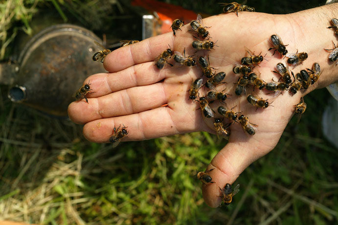 Рабочая пчела работает при медосборе где-то в радиусе 3км. Естественно, она стремится, где ближе и интенсивнее цветение: так больше донесет до улья... Бывало, что даже не знамо по какой причине вдруг всегда нормально ведущая себя при осмотрах семья взбеленится.... Но все-таки главное зависит от умения пчеловода: работать быстро, не держать гнездо долго открытым, не работать под хмельком или сильно накуренным, не стучать, все движения должны быть плавными, не суетиться... Пчела быстро воспринимает нервозность пчеловода, или страх человека ( она как никто другой легко определяет возрастание адреналина у человека в крови...) У меня был случай, когда снимая магазин случайно он сорвался и стукнулся о корпус... Да уж, поволноваться пришлось. Причем очень важно, почувствовав возрастание агрессивности пчел при осмотре, спокойно его прекратить и не смотря ни на что закрыть улей.... Ведь, бросив открытым улей и потревоженную семью, да еще начать шарахаться-бежать, то ведь пчелы могут дать такого жара всей округе.... Так что тут думаешь прежде всего о последствиях для соседей... Лучше претерпеть десяток-другой ужалений, чем иметь соседские проблемы... Кстати, постепенно реакция на ужаления снижается, вырабатывается иммунитет к ним...