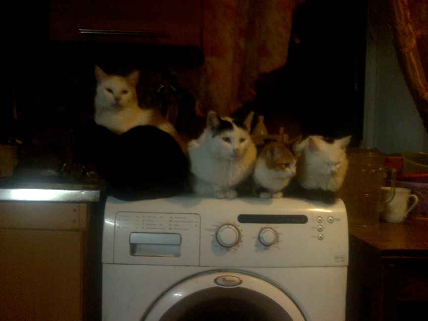 Это, когда мы обедать садимся, все выстраиваются по ранжиру, типа мы здесь не при чём, мы телевизор смотрим. Воспитанные, в тарелку с лапами не лезут, но бдят.