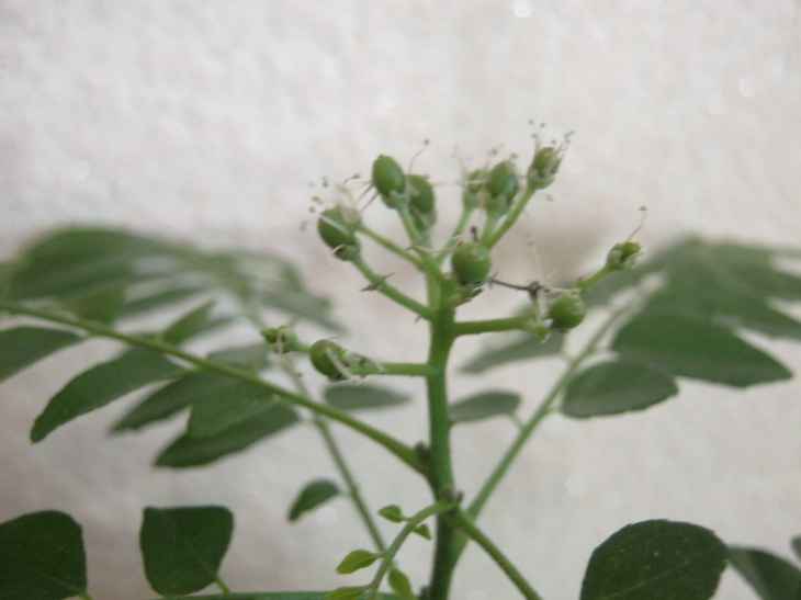 Посчитала я более правильно, получается, что начала цвести моя мурайка через 4 года, может даже 4, 5. Под фито лампой зацвела, раньше никак не хотела. В это же самое время она начала и ветвится. Сейчас выпускает две боковых веточки. Стволик стал мощнее, ягодки растут. Наверное как сил набралась, так и плоды решила завязать.