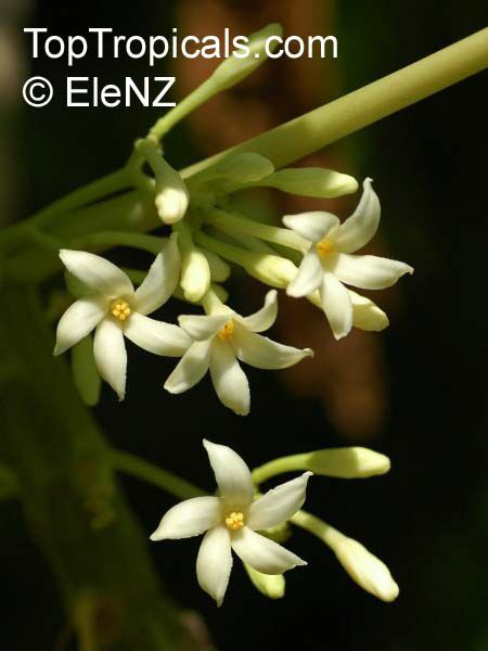 Родина дынного дерева Тропическая Америка. Папайя является травянистым быстрорастущим кустарником, поэтому растёт одним стволом, не выпуская боковых побегов. Ствол всегда остаётся зелёным и мясистым, в основном не покрываясь корой. Крупные шрамы покрывают весь ствол, на протяжение всей жизни папайя выпускает новую листву сбрасывая нижние и тем самым оставляет глубокие шрамы. Листья довольно крупные 55-75см в диаметре. Цветы по форме напоминают плюмерию, но они намного мельче, появляются они из главного стебля. Плоды от жёлтого до оранжевого цвета могут весить до 9 кг, но обычно их вес не превышает 0,5кг. Свисают они на небольших стебельках. Определить спелый плод можно по тому, как он становится мягким и оранжевым цветом. Вкусовые качества у фрукта очень высокие, он напоминает вкусы дыни и абрикоса. Цветение и плодоношение происходит одновременно в течение года. В основном Гавайские папайи можно встретить в продуктовых магазинах США, Мексиканские сорта папайи намного крупнее и весят до 5кг, видимо поэтому потребители сделали выбор на небольших плодах именно Гавайского сорта. Практически во всех тропических регионах папайю можно встретить как садовое растение. Вырастить это растение из семян совсем не сложно. Семена прорастают уже через 10-15 дней, высаживать семена надо сразу по горшочкам. Корневая система папайи очень хрупкая и практически не один сеянец на нашей практике не пережил пересадки. Растение должно окрепнуть и заполнить весь горшок корнями, и только тогда оно будет готово к пересадке. Мы получаем массу вопросов от клиентов которые недоумевают почему же гибнет вроде бы здоровый с виду сеянец? Дело в том что корни дынного дерева очень нежны и полив прохладной водой (а прохладной для папайи считается даже вода комнатной температуры) могут погубить корневую систему. Полив должен быть водой не менее 30С, плюс растению необходим хороший дренаж, от слишком влажной почвы корни могут недополучить кислород и погибнуть. Вот такое капризное растение, любит что бы ноги всегда были в тепле. Растение будет прекрасно расти на светлом и тёплом месте.