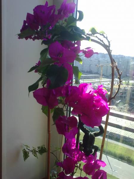 А я бугенвилии свои на овальную опору накрутила, она веточек надавала по всему стебельку, как арочка получилась, красиво.